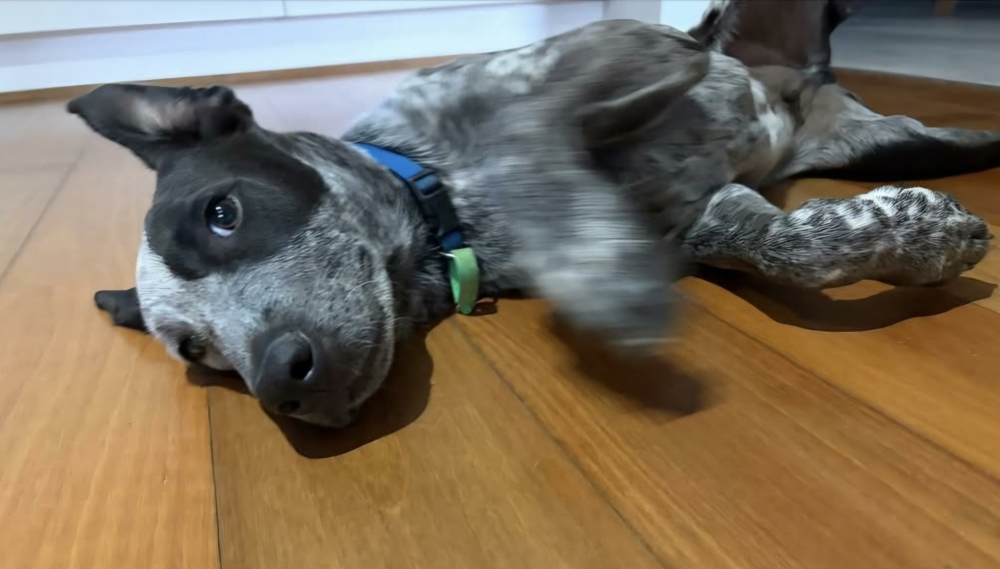 His current hobbies include sleeping in ridiculous positions, rearranging blankets for maximum sleeping comfort, playing with his toys only by himself and hunting for the perfect stick.